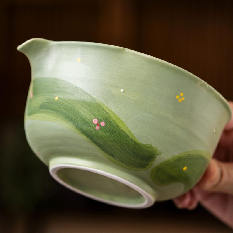 This ceramic matcha bowl with oil-painting pattern is a beauty. Its spout allows for easy pouring. High - temperature fired for sturdiness. The hand-painted green forest wave pattern is cute and elegant. Inside, a smooth glaze makes cleaning effortless. It's microwave - and dishwasher - safe. More than a matcha - making tool, it's an art piece. Ideal for matcha enthusiasts who value both function and aesthetics in one charming bowl.